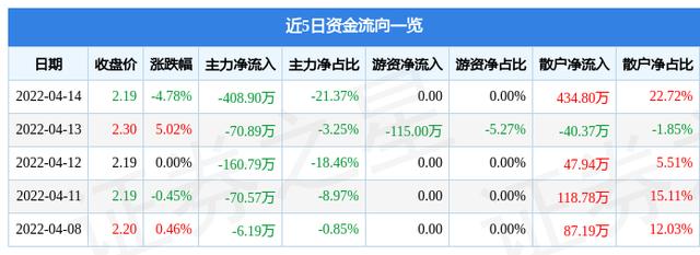 资金流向数据方面,当日主力资金净流出408.9万元,游资资金净流入0.0万元,散户资金净流入434.8万元。近5日资金流向一览见下表: