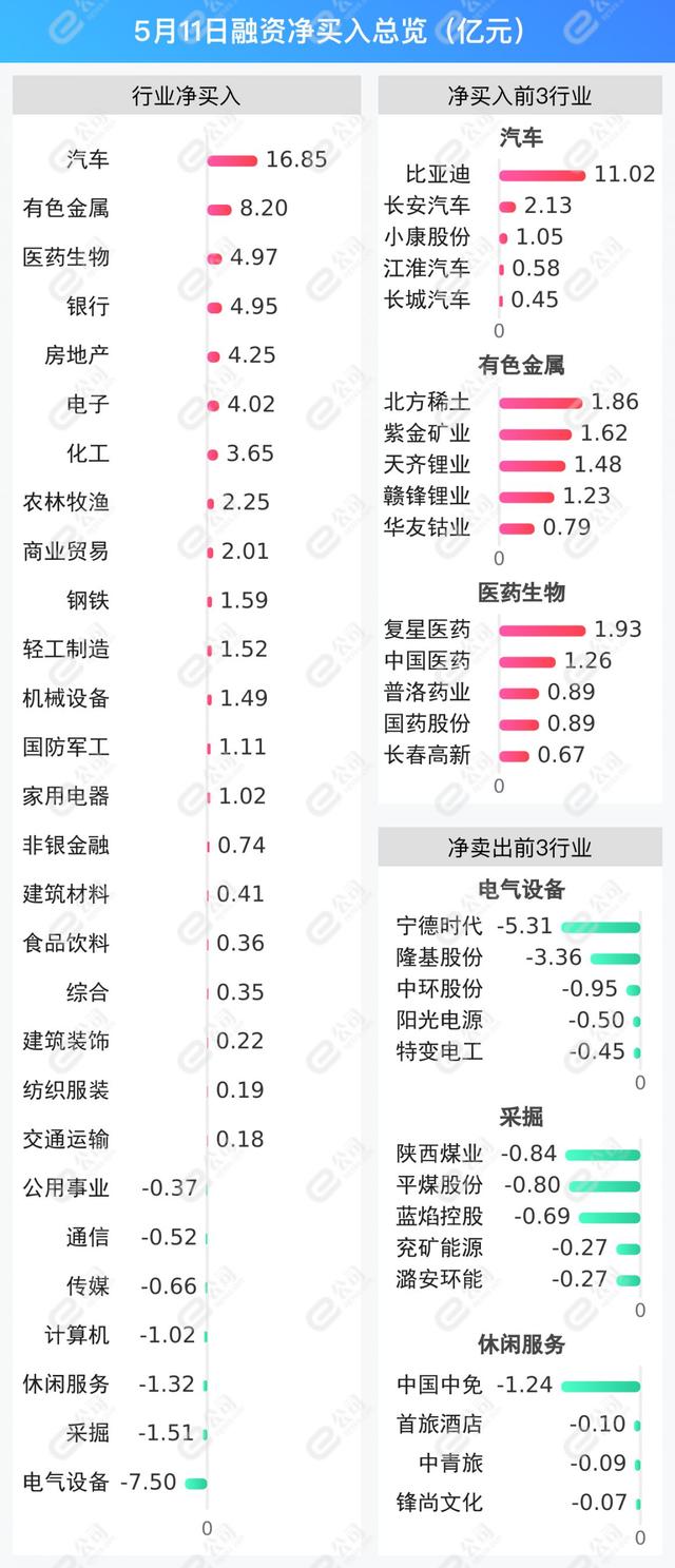 汽车、有色金属、医药生物获融资净买入金额居前,分别为16.85亿元、8.2亿元、4.97亿元。