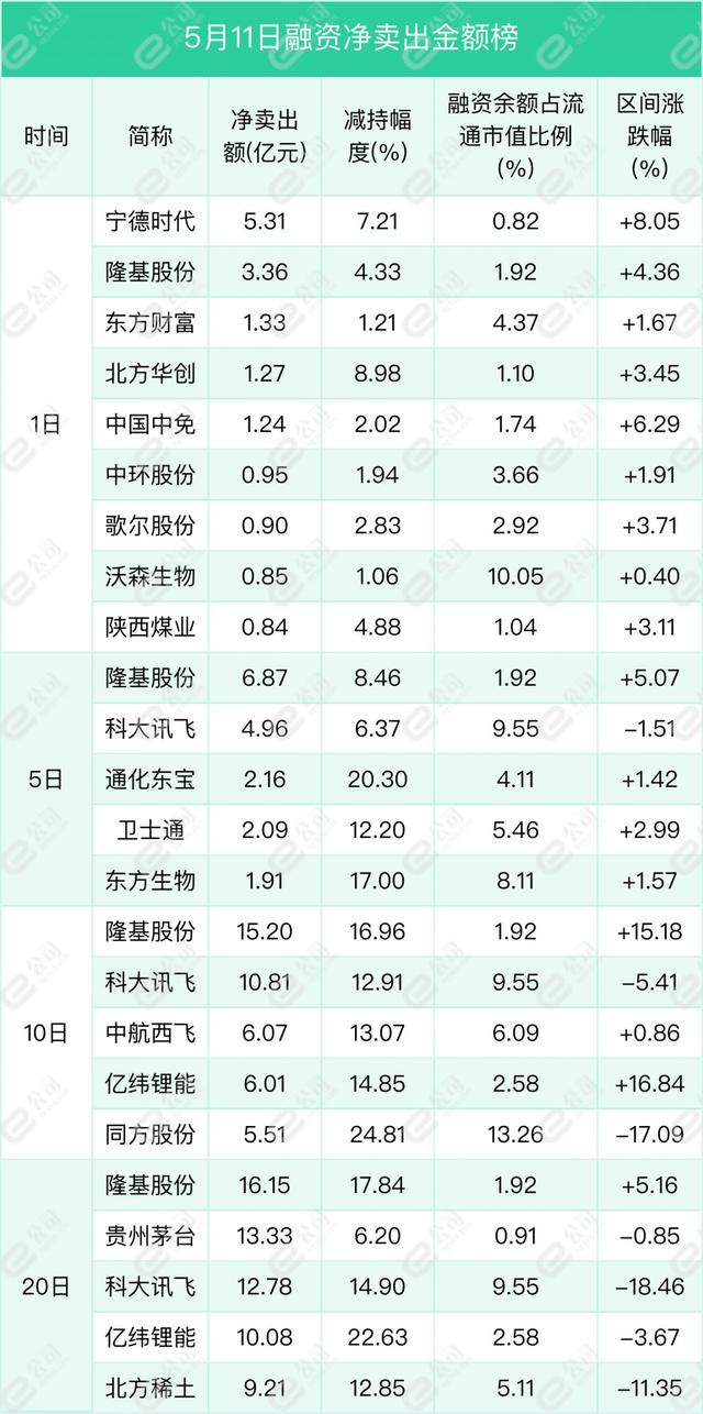 宁德时代、隆基股份、东方财富遭融资净卖出金额居前,分别为5.31亿元、3.36亿元、1.33亿元,减持幅度分别为7.21%、4.33%、1.21%。