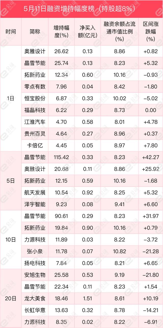 从增减持幅度来看,融资余额占流通股比例超8%的个股中,奥雅设计、晶雪节能、拓新药业获融资增持幅度居前,分别为26.62%、25.74%、12.34%。