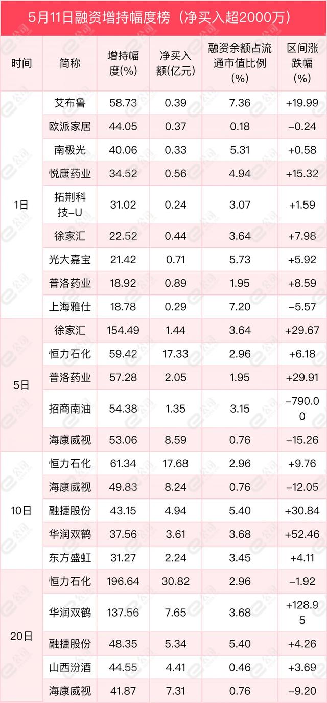 从增减持幅度来看,单日净买卖超2000万元以上的个股中,艾布鲁、欧派家居、南极光获融资增持幅度居前,分别为58.73%、44.05%、40.06%。