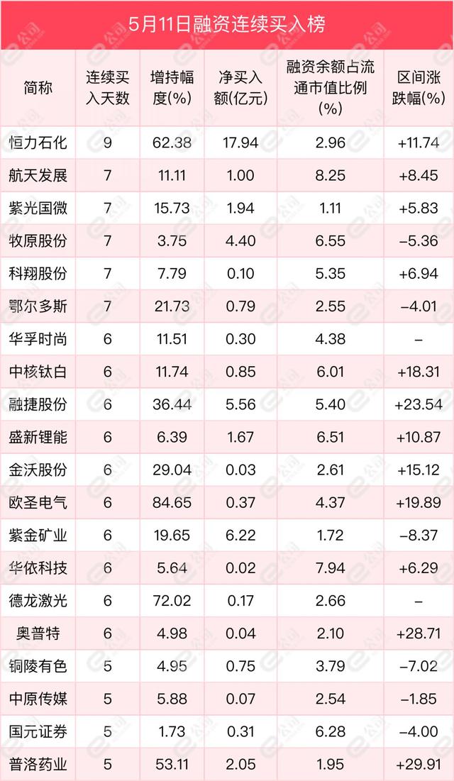从连续买卖来看,恒力石化、航天发展、紫光国微获融资连续净买入天数居前,分别为9天、7天、7天,期间净买入额分别为17.94亿元、1亿元、1.94亿元,期间增持幅度分别为62.38%、11.11%、15.73%。