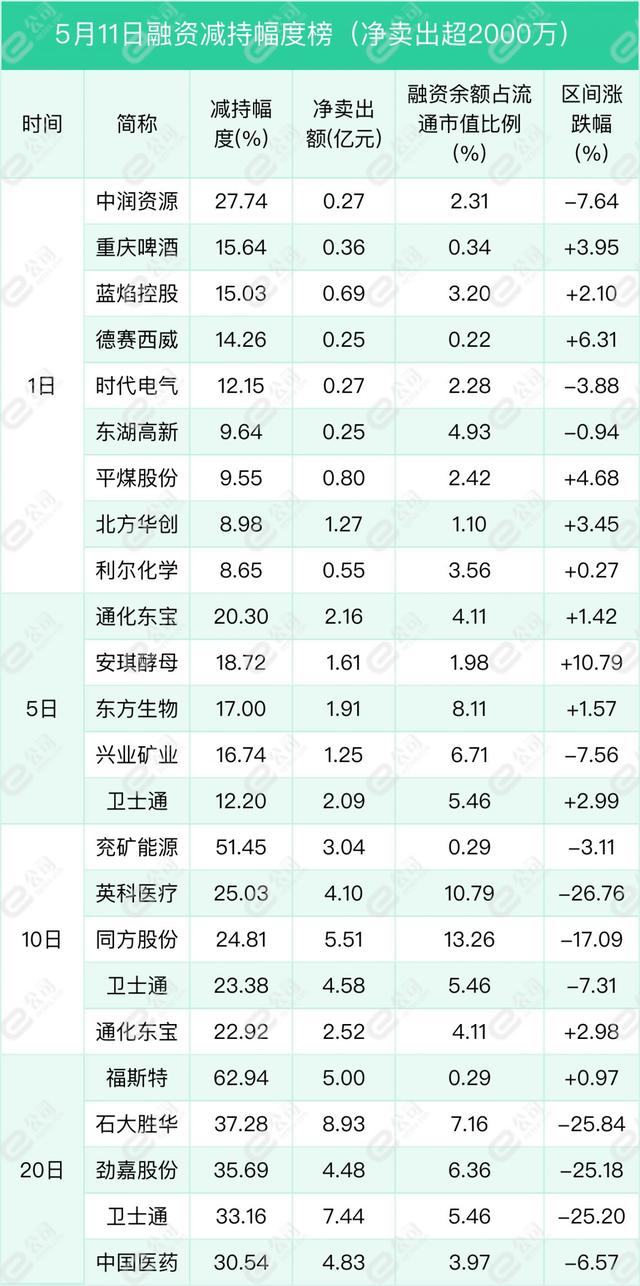 中润资源、重庆啤酒、蓝焰控股遭融资减持幅度居前,分别为27.74%、15.64%、15.03%。