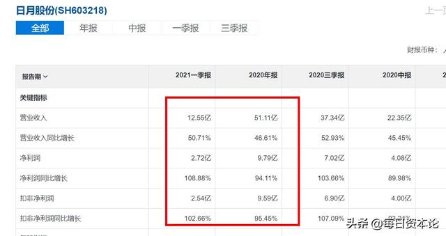 股价的走势从一个侧面也反应了其业绩。近5年,日月股份的营收和净利润都呈现由低逐渐走高的态势。尤其是净利润,2016年和2017年同比都是2位数下降,但从2018年开始快速提升。2020年其营收51.11亿元,同比增长46.6%;归母净利润9.79亿元,同比增长94.1%;扣非归母净利润9.59亿元,同比增长95.45%。2021一季度日月股份营收12.55亿元,同比增长51%;归母净利润2.72亿元,同比增长109%;扣非归母净利润2.54亿元,同比增长103%。