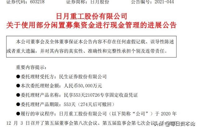 2020年1月6日,日月股份拟使用不超过9亿元的部分闲置募集资金购买保本型理财产品或结构性存款。当年12月3日,其又拟使用不超过26亿元的部分闲置募集资金购买保本型理财产品或结构性存款。最新的是2021年7月28日,日月股份公告称,拟用闲置资金5亿元购买民生证 股份有限公司的固定收益凭证。