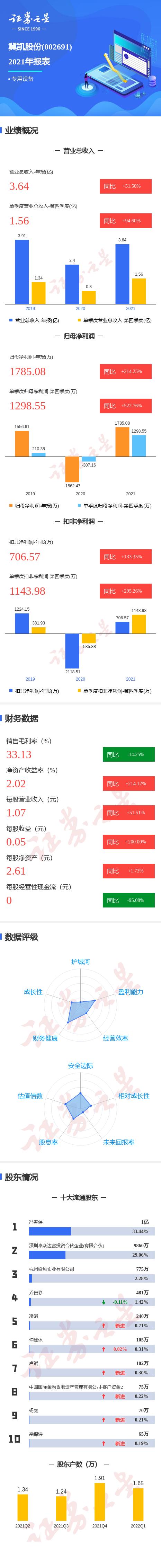 冀凯股份2022一季报显示,公司主营收入6486.59万元,同比上升38.21%;归母净利润89.36万元,同比下降82.52%;扣非净利润-44.75万元,同比下降111.29%;其中2022年第一季度,公司单季度主营收入6486.59万元,同比上升38.21%;单季度归母净利润89.36万元,同比下降82.52%;单季度扣非净利润-44.75万元,同比下降111.29%;负债率19.27%,投资收益1.67万元,财务费用117.24万元,毛利率32.65%。