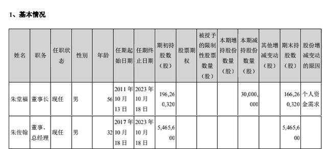 董事长朱堂福报告期间因个人资金需求减持30,000,000股,期末持股数166,260,320。