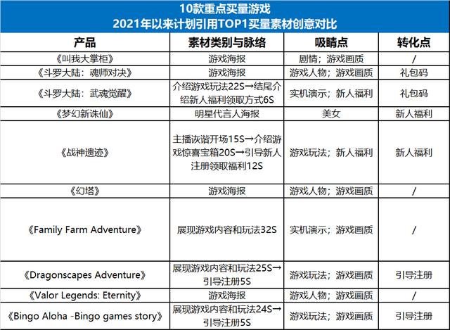 值得关注的是,10款产品中计划引用TOP1素材中含有“转化点”的只有60%。4支不包含“转化点”的创意素材有3支均为游戏海报。