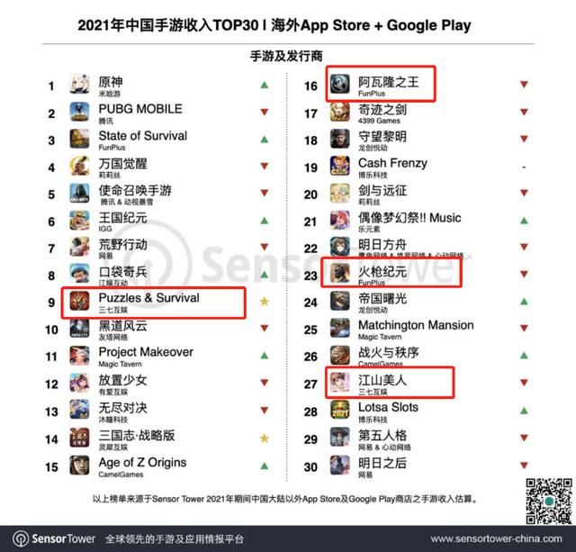 Sensor Tower数据显示,三七互娱旗下的《Puzzles & Survival》、《江山美人》分别位列2021年中国手游出海收入第9与27位;世纪华通代理发行的《阿瓦隆之王》和《火枪纪元》分别位列榜单第16与23位。
