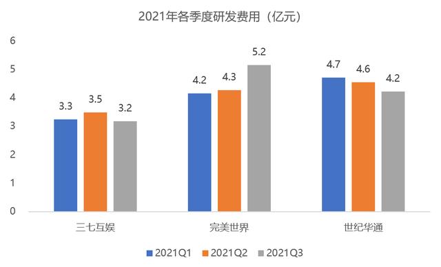 从研发投入金额来看,完美世界和世纪华通不相上下,2021Q1-Q3研发投入超13亿元,三七互娱略逊一筹,年内研发投入也近10亿。