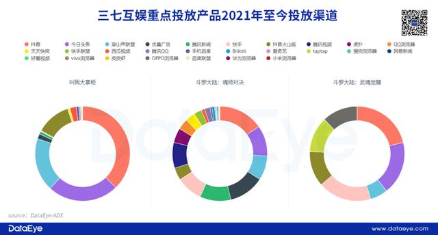 从覆盖的渠道数量来看,三七互娱自研游戏《斗罗大陆:魂师对决》渠道分布相对均匀,投放渠道数量远超其余两款代理游戏,两款代理游戏投放渠道高度集中,主推抖音和今日头条两大渠道。