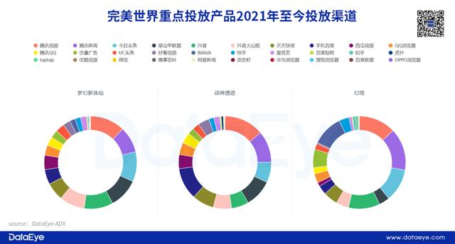 和三七互娱相比,完美世界投放渠道以腾讯系和字节系为主,两大体系占比超六成。从覆盖的渠道数量来看,完美世界三款游戏覆盖的渠道更广,整体投放更为均衡。