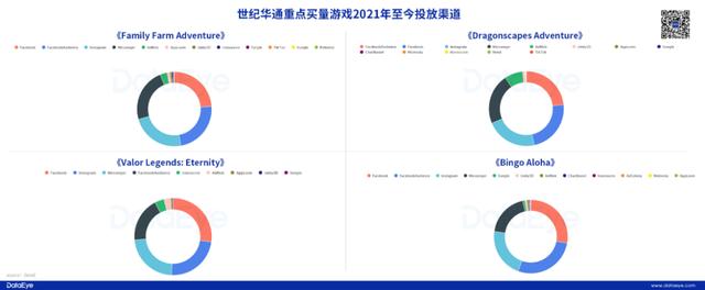 海外方面,世纪华通四款出海产品均选择以Facebook系作为主投渠道,如果算上Facebook旗下平台Instagram和 Messenger,这家美国社交媒体巨头几乎包揽了超过90%的投放资源。