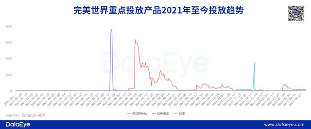 完美世界在21年加大了投放力度,但整体投放量远低于三七互娱。旗舰手游《梦幻新诛仙》总投放量达32699组,《战神遗迹》累计投放素材数也过万。