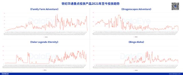 相比之下,世纪华通国内两款游戏投放量较少,投放主要集中在海外新游,《Family Farm Adventure》和《DragonscapesAdventure》是公司21年重点投放的新游产品。