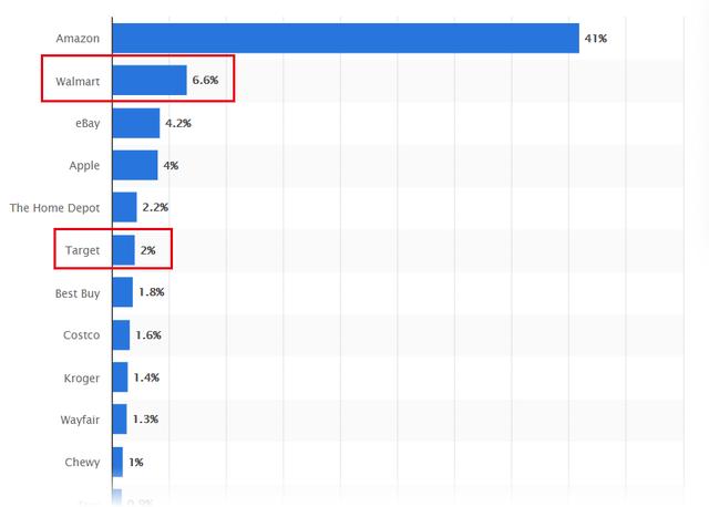 仅从线上零售销售份额显示,沃尔玛和Target分别占据美国线上零售的6.6%和2%。