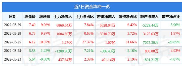 资金流向数据方面,上个交易日主力资金净流入6869.64万元,游资资金净流入5628.04万元,散户资金净流出5229.44万元。近5日资金流向一览见下表: