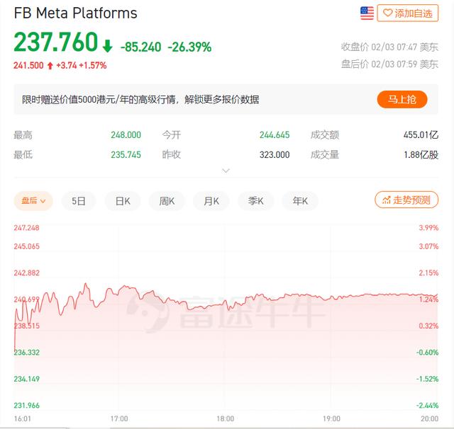 美东时间2月3日,Facebook母公司Meta(NASDAQ:FB)股票开盘大跌,截至当日收盘,股价暴跌26.39%,至237.76美元。约2370亿美元(约合人民币1.5万亿)市值蒸发,相当于一夜跌去一个工商银行的市值规模。盘后稍有缓和,截至美东时间18时20分,股价较收盘时微涨1.5%。