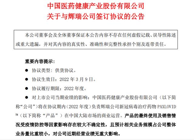 中国医药此前公告称:公司在协议期内(2022年度)负责辉瑞公司新冠病毒治疗药物Paxlovid在中国大陆市场的商业运营。