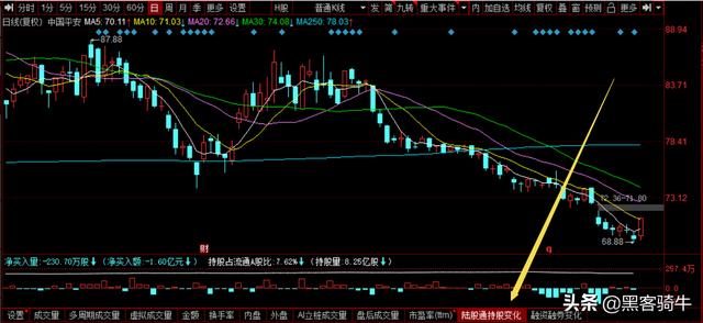 如图,中国平安的日K线图下方的“陆股通持股变化”,可以比较直观地看到个股每日的外资流入流出,但要说明的一点是,这里的数据不是很准。
