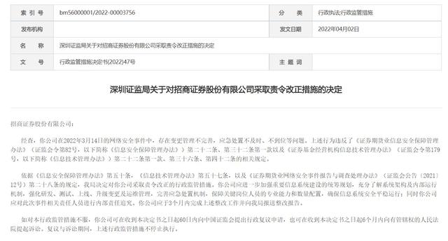 中新财经4月4日电 近日,深圳证监局下发关于对招商证券股份有限公司采取责令改正措施的决定。经查,招商证券在2022年3月14日的网络安全事件中,存在变更管理不完善,应急处置不及时、不到位等问题。对此,深圳证监局决定对招商证券采取责令改正的行政监管措施。