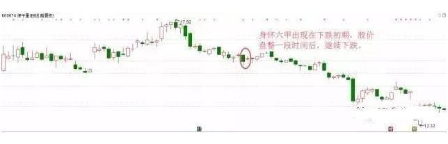 3、若“身怀六甲”出现在股价明显下跌趋势中且跌幅不大时,股价可能会横盘或弱势反弹,但一般不会改变下降趋势,此时这个信号极可能是加速下跌的信号。
