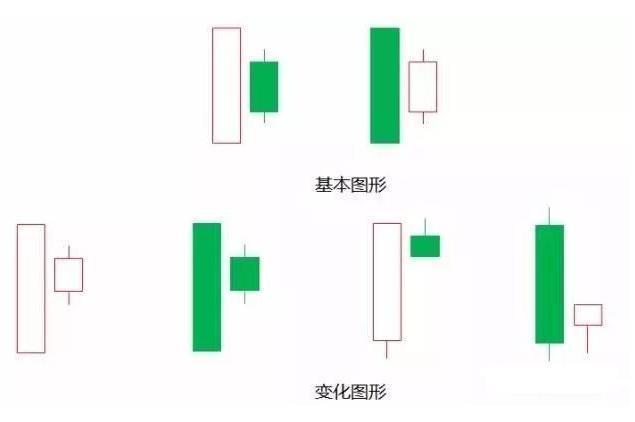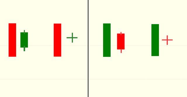 1、第1根K线的实体将第2根K线的小实体完全包容起来。