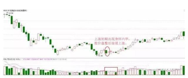第一次出现身怀六甲时,第一根K线放量后,之后成交量缩小,很可能判断成为上涨过程中的回调。