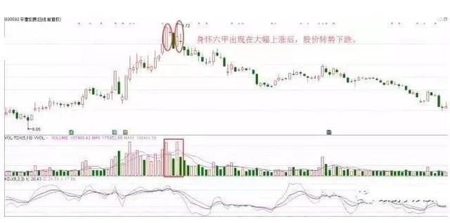 2、若“身怀六甲”出现在股价已大幅上涨后,此时这个信号极可能是强烈的转势下跌信号。