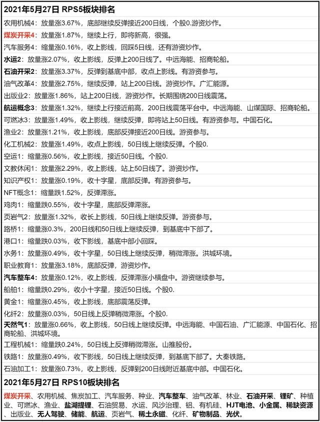 注:RPS是股价相对强度指标,代表在一段时间内,个股涨幅在全部股票涨幅排名中的位次值。运用在板块上则代表一段时间内该板块在所有板块中涨幅排名。例如RPS5板块排名代表近5日内的板块表现排名。红色是较为持久的板块,黑色加粗是比较强势的板块,黄色是新进板块(个人判断)。板块名称后的数字表示RPS5日、10日、15日、20日在90以上的数量,例如”空运4“代表空运板块的4个RPS都排名在前10%分位。