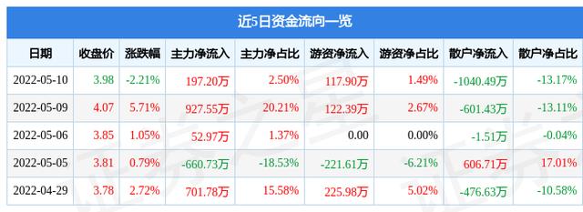 资金流向数据方面,5月10日主力资金净流入197.2万元,游资资金净流入117.9万元,散户资金净流出1040.49万元。