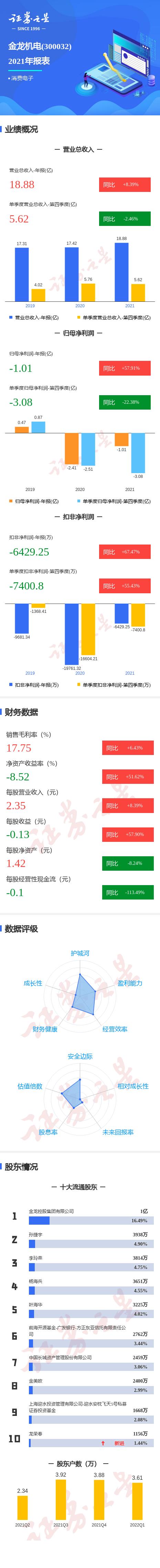 本文摘要:金龙机电2021年报显示,公司主营收入18.88亿元,同比上升8.39%;归母净利润-10159.09万元,同比上升57.91%;扣非净利润-6429.25万元,同比上升67.47%;其中2021年第四季度,公司单季度主营收入5.62亿元,… …