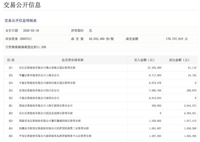 3月19日,西安饮食异常期间价格涨幅偏离值累计达到21.27%,当日成交金额2.43亿元;3月18日,西安饮食日价格涨幅偏离值达到11.55%,当日成交金额达到1.79亿元,长江证券股份有限公司佛山南海大道证券营业部位列买一席位,当日买入2740.53万元,卖出6.1万元。