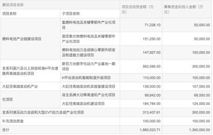 具体来看资金用途,潍柴动力计划将20亿元用于燃料电池产业链建设项目,40亿元用于建设全系列国六及以上排放标准H平台道路用高端发动机项目,30亿元用于建设大缸径高端发动机产业化项目,30亿元用于全系列液压动力总成和大型CVT动力总成产业化项目,10亿元用于补充流动资金。