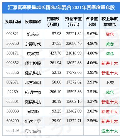 汇添富高质量成长精选2年混合的前十大重仓股如下: