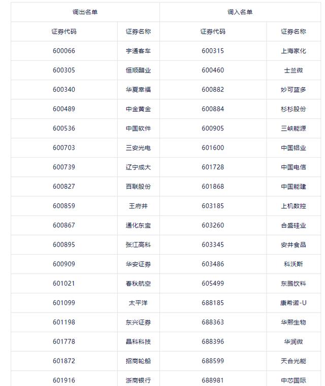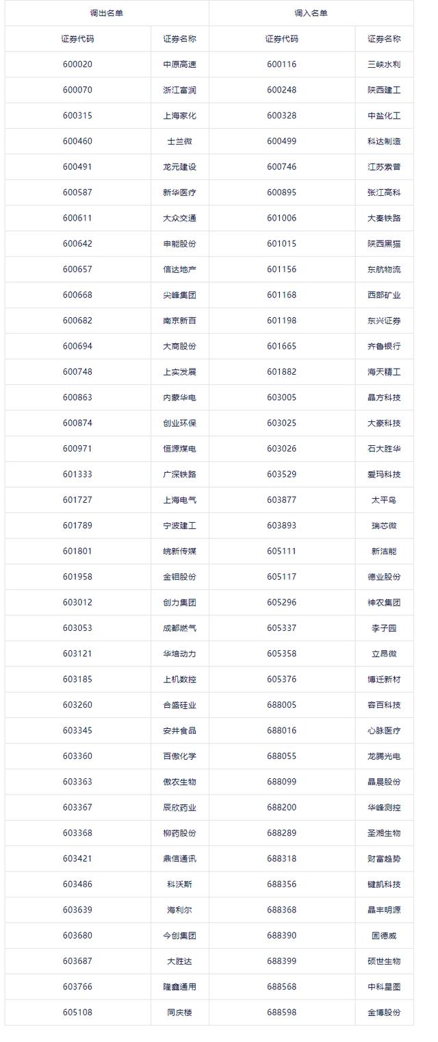 上证380指数替换38只股票,调入13只科创板样本。三峡水利、陕西建工、中盐化工等股票进入指数,中原高速、浙江富润、上海家化等个股被调出指数。