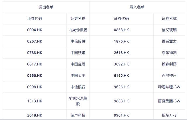中证香港100指数更换8只样本,九龙仓集团、中信股份、中国铁塔等被调出指数,信义玻璃、百威亚太等进入指数。