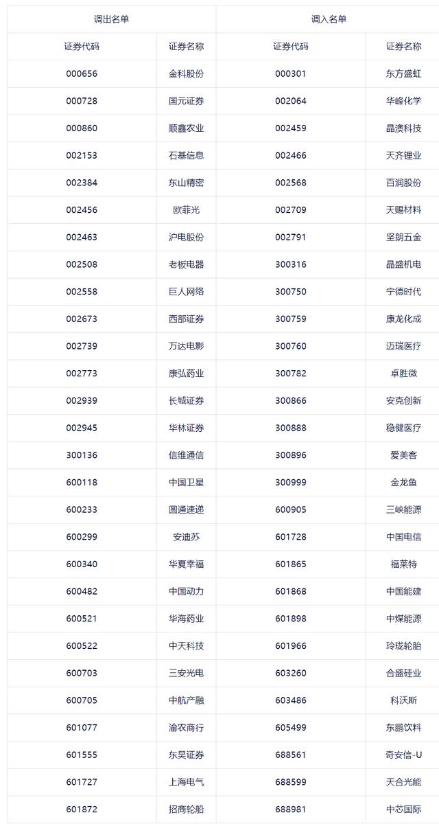 其中沪深300指数更换28只样本,金科股份、国元证券、顺鑫农业等被调出,东方盛虹、华峰化学、晶澳科技、天齐锂业等被调入。