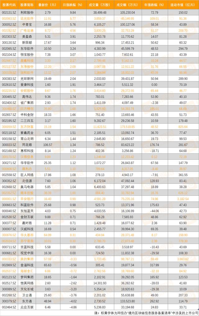 作为两市首个区块链指数,区块链50指数的样本中,同样也有区块链备案企业的深交所上市公司。具体来看: