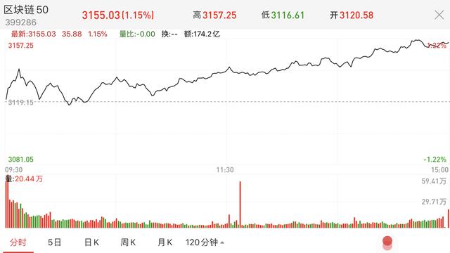 从今日盘面来看,该指数以3120.58点开盘后,快速走高并转跌。早盘10时许,该指数在3116.61点处形成支撑,并转头一路走高。截至收盘,区块链50指数报收3155.03点,收涨1.15%。从整体A股市场来看,沪指今日收涨0.67%,深成指涨1.32%,创业板指涨1.91%。