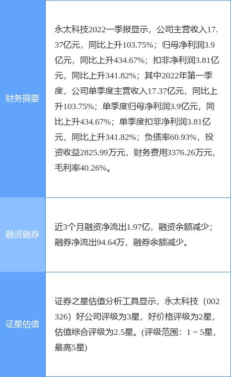 本文摘要:4月27日盘中消息,13点41分永太科技(002326)封涨停板。目前价格24.23,上涨9.99%。其所属行业化学制品目前上涨。领涨股为回天新材。该股为锂电池,氟化工,新能源汽车概念热股,当日锂电池概念上涨6.82%,氟化工概念上涨5.9… …