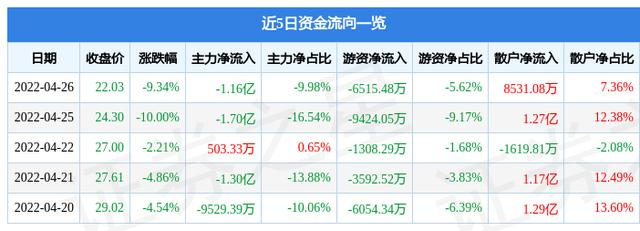 资金流向数据方面,4月26日主力资金净流出1.16亿元,游资资金净流出6515.48万元,散户资金净流入8531.08万元。