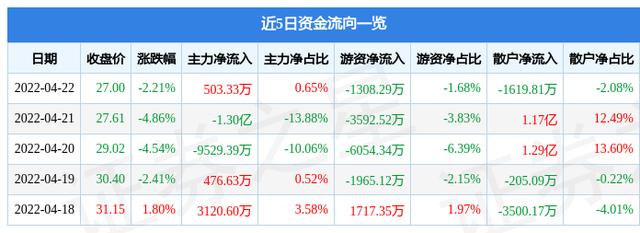 资金流向数据方面,上个交易日主力资金净流入503.33万元,游资资金净流出1308.29万元,散户资金净流出1619.81万元。近5日资金流向一览见下表: