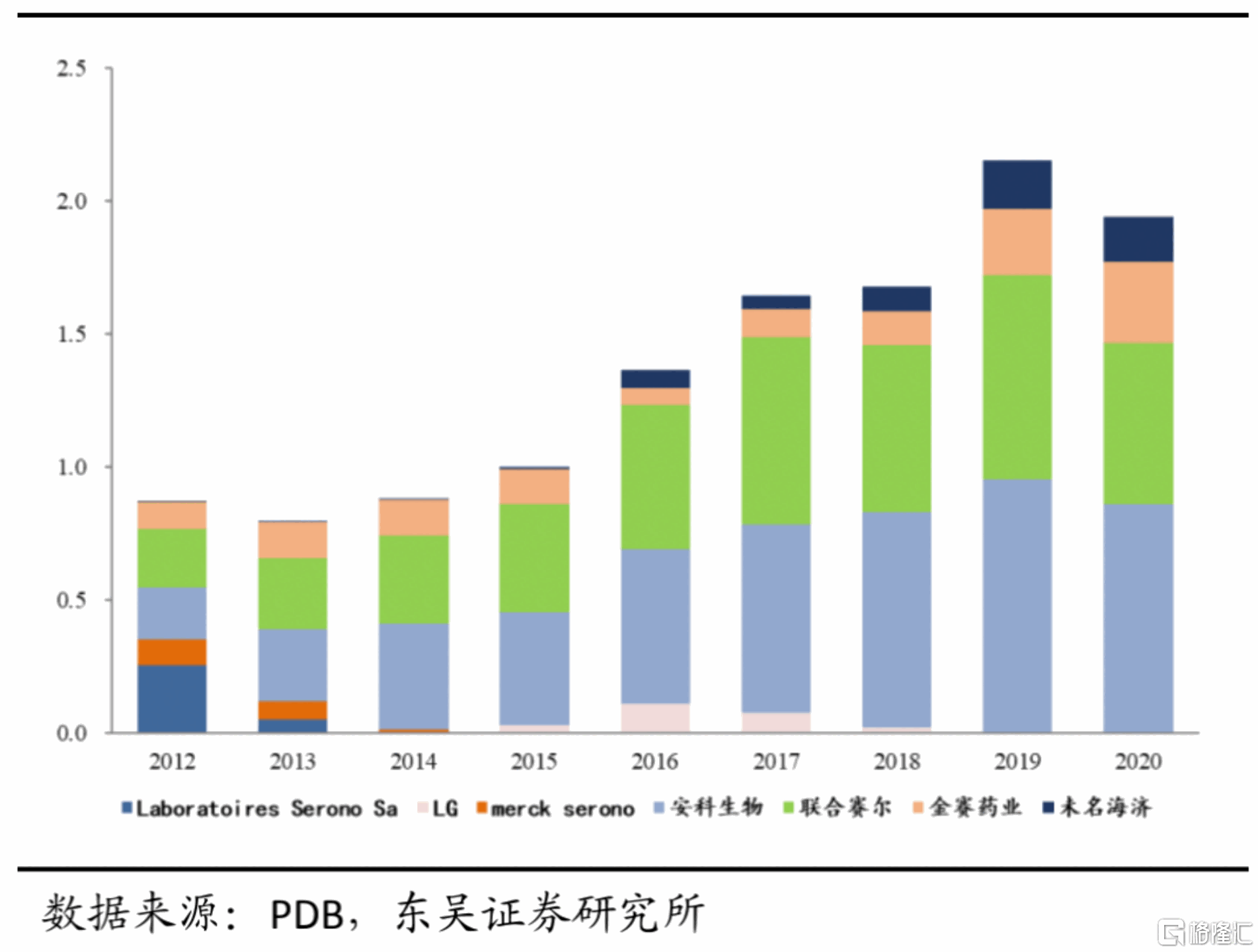 先看粉针,目前市场的主要玩家按照营收从大到小依次为:安科、联合赛尔、金赛、海济,最多再加一个LG(其余几乎可以忽略不计),下图为2012-2020年样本医药生长激素粉针销售情况(亿元)