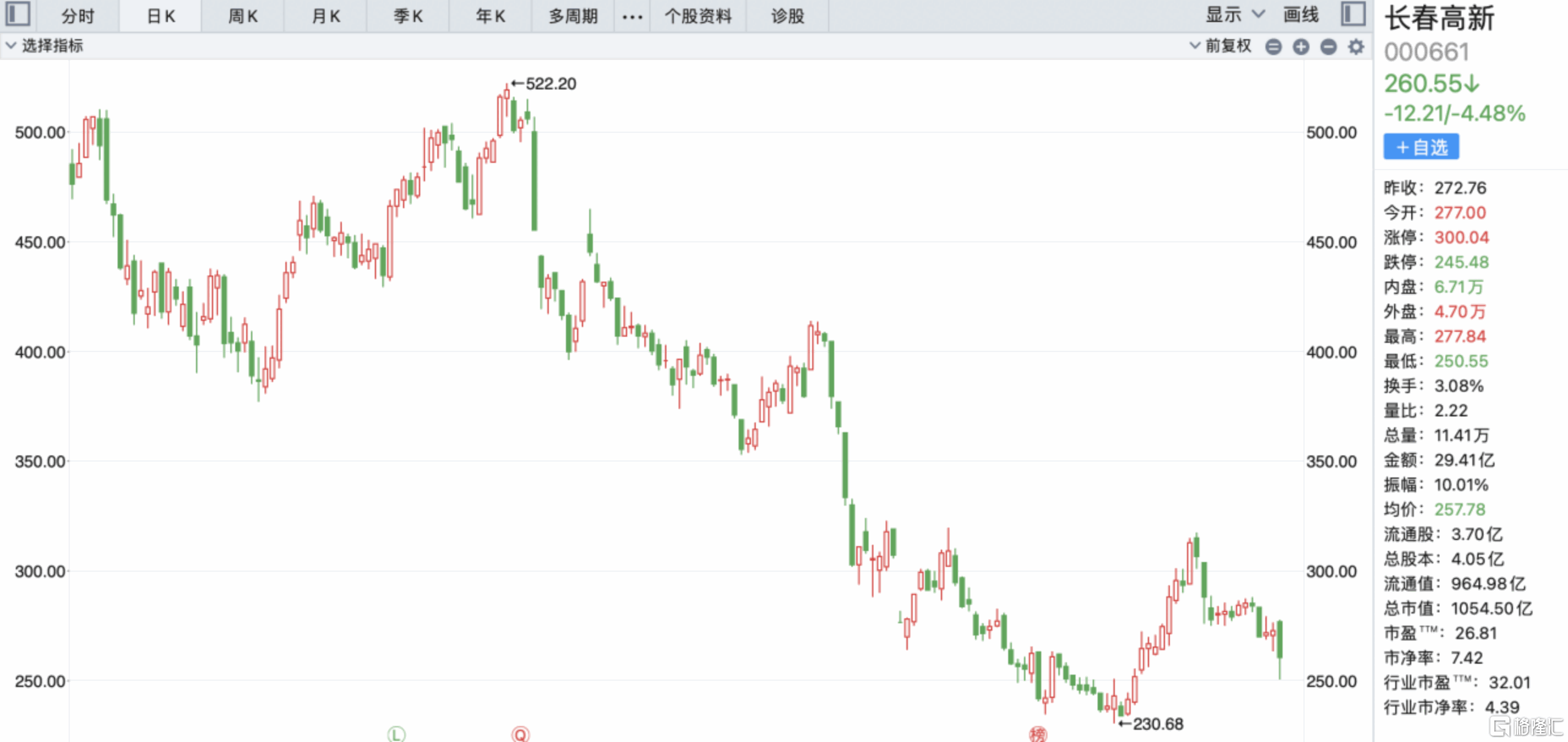 长春高新作为国内生长激素龙头,水针配套电子注射笔与长效剂型满足多元化需求,市场接受程度高,同时业绩一直保持高增速,是股民心中的大白马。但从5月21日开始,受生长激素带量采购事件的市场悲观情绪影响,公司股价从高点522元一路下跌,最大回撤超过50%,惨不忍睹。