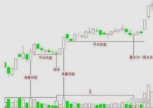 3、倍量后的走势、走势在倍量柱体上方震荡、成交量减小、主力洗盘行为。