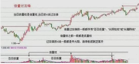 凡是“倍量过左锋”的股票都有一些共同点,一般都是处于相对低的价位,往往存在“百日低量”、“长阴短柱”或“长腿踩线”等量柱和K线的走势形态,