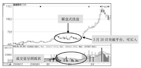 横盘式洗盘,在K线图中反映出来往往为一条横线或长期的整理平台。从成交量来看,在平台整理过程中,成交量呈递减的状态,即在整理平台上没有或很少有成交量放出,成交清淡,成交价格也极不活跃;随着新增资金的陆续入场,成交量也逐步呈现出放大的状态,与前一阶段的成交量遥相呼应,形成圆弧底形态,股价也开始缓慢上扬。