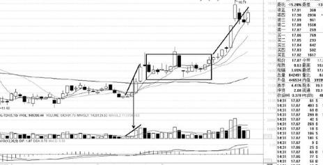(1)由于主力的积极介入,原本沉闷的股票在成交量明显放大的推动下变得活跃起来,出现了价升量增的态势。然后,主力为了给以后的大幅拉升扫平障碍,会将短线获利盘强行洗去,这一洗盘行为在K线图上表现为阴阳相间的横盘震荡。同时,由于主力的目的是要一般投资者出局,因此,股价的K线形态往往呈明显的“头部”形态。图2-1为2015年2月11日~16日的万向钱潮,出现了庄家积极介入的信号,股价先拉升,再盘整,再拉升。