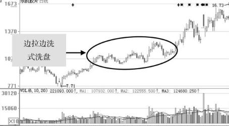 边拉边洗式洗盘,是指主力将洗盘与拉升融为一体,在拉升的过程中,同时进行洗盘。这种洗盘方法就是主力先将股价拉高,然后停止做多,此时短线的升幅已经很大了,为了将持股信心不坚定的投资者洗出,主力于是在高位抛出一小部分筹码,使股价出现回落走势,但同时主力又不会让股价下跌太多,让股价始终还是处于上涨趋势,这就好诱骗场外的持币者介入,这样筹码就完成了一进一出,得到充分交换,同时主力又锁定了长线筹码,为他日后大幅拉升股价减轻了压力,可谓一举多得。